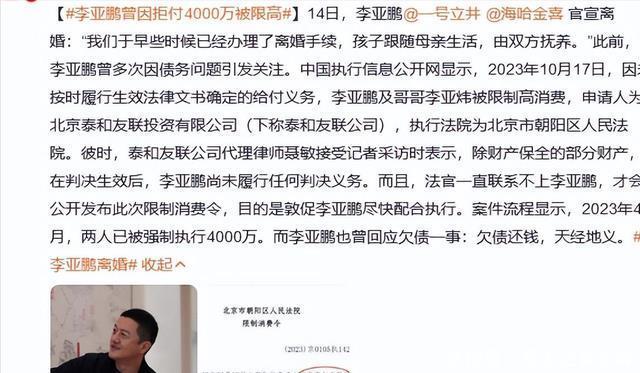 在阅读此文之前,辛苦您点击一下“关注”,既方便您进行讨论和分享,又能给您带来不一样的参与感,感谢您的支持!       文丨       呦呦鹿鸣       编辑丨       爱吃叉骨       “李亚鹏可能不是个好丈夫,但一定是个好父亲。”       最近他和海哈金喜离婚的消息一出来,很多人都说他是第二个汪峰。       面对质疑他只是说希望大家少操心别人的生活,幸好他还有个女儿帮他。       李亚鹏也没想到,离婚不到一周,19岁女儿李嫣靠一个举动实现口碑暴增,顺便挽回他的名声。       离婚原因       李亚鹏离婚只能说是在意料之中,近几年确实过得不太顺利,五十多岁的人了,还不服输,做生意赔了不少钱。       当年王菲就是因为这点和她离婚的,这次他还不长记性。       先说他跟王菲离婚,当年两人官宣离婚,说是缘分尽了,别见说的模糊,其实到底怎么回事大家都知道。       那时候王菲是乐坛天后,名气很大,并且赚钱还比老李多,一开始他拍戏的时候还挺稳定的,       谁能想到后来不知道哪根筋搭错了,开始想着做生意,做梦都想当大老板闯出一番天地。       于是他从演员转行去做生意,他投了很多钱去弄什么艺术小镇,最后投的钱全都打了水漂。       再后来又开始弄红酒、文旅这些行业,结果没一个做成的,忙到最后欠了一屁股债。       王菲其实帮了他不少,陪他做公益,甚至他缺钱的时候也会帮忙,但是再怎么帮忙,也架不住李亚鹏折腾的快。       当年王菲就说他像八爪鱼,之前还不明白是什么意思,看到现在这情况就懂了。       再就是这次和海哈金喜离婚,两人的原因也离不开钱,他们还有了女儿,这时候他的重心居然不放在家庭上。       非要出去继续打拼,总想着自己一定能成功,和海哈金喜结婚前李亚鹏就欠着钱,女人也是知道的,但还是愿意嫁给她。       女方就想过安稳的生活,希望老公能多照顾一下家庭,这样对孩子也好,但男人结婚了跟没结一样,还是我行我素。       海女士想直播带货赚钱,好补贴家里,还被老李以“女人该相夫教子”为由拦住了,有点大男子主义了。       后来欠钱越来越多,压力越来越大,一家人只能从大平层搬到出租屋,这可能是压倒海哈金喜的最后一根稻草。       最后两人还是以离婚收场,两次婚姻都是同一个原因结束的,他好像一点也意识不到,这次离婚也让他口碑下滑。       幸好他还有个贴心的小棉袄女儿,他可能也没想到,离婚不到一周时间,19岁的李嫣就靠一个举动实现口碑暴增,顺便挽回了李亚鹏的名声。       口碑暴增       自从他离婚后,网上就说老李亏欠李嫣等等,最后李嫣否认“欠债”的说法,她表示不是老李欠她的,       而是从她出生起治疗唇腭裂的钱就花了上千万,老李为此辞了演员这个行业,全程陪伴她治疗,老李对她的付出没法用金钱衡量。       其实早在五月的时候她就支持过老李,在参加晚会的时候也讲过,她表示老李虽然喜欢经商,但对她的爱还是和以前一样,一点没减少。       还呼吁网友停止攻击老李,她是真的很心疼爸爸,有这么一个贴心小棉袄在,老李的口碑都跟着反转了。       离婚还不到一周,李嫣就靠着一句话实现就被暴增,老李有她这个女儿,做梦都能笑醒。       以前她总被议论,因为她天生唇腭裂,父母又是明星,有人觉得她是娇生惯养的星二代,可实际上她被王菲和李亚鹏养的很好。       面对和她一样天生唇腭裂的小朋友她会鼓励,会蹲下身来照顾小朋友,真的太暖心了。       而李亚鹏虽然生意没做好,却教出了这么好的一个女儿,这大概是他最成功的事了。       还是那句话他可能不是个好丈夫,给不了妻子安稳的生活,但他一定是个好父亲。       离婚这件事对老李好像一点影响也没有,刚离婚就直播带货,状态那叫一个好,一点看不出是刚离婚的样子。       除了直播他还在社交平台上发了请假视频,还喝着药,看着老了不少。       发视频泡茶       ��号他在短视频平台发了自己请假的视频,他表示最近天冷了,因为身体不舒服所以请假,晚上不直播了。       视频一开始镜头在拍着他面前的杯子,只见他拿起茶壶倒了一杯水,然后打开药把药加进去。       最后镜头往上一抬,就露出了他这个人,他穿着灰色的厚外套,里面搭配深蓝色高领毛衣,       穿的特别厚,都要把自己裹成熊了,不过他感冒了,就比较怕冷,穿成这样也正常。       再看他状态确实沧桑了不少,看着比较苍白,没有什么精气神,嘴唇也干裂,本来就变苍老的脸,       一感冒更苍老了,脸上皱纹明显,不过和我们普通人比起来,这状态样子算是很好了。       评论区的网友看到他这样也不忍心,网友让他买日用品,自己砸锅卖铁也会支持老李,还有的夸赞老李的基金会。       没想到评论区全是支持他的网友,很多人给他出招,告诉他卖什么赚钱等等,网友也是真操心他啊!       希望他能在晚年的时候走向成功吧,早点还完钱,让两个女儿过上好生活。       不知道您对此有什么看法呢?欢迎在下方评论区留下你的想法,喜欢文章记得点赞关注我们下期再见。       [免责声明]文章的时间、过程、图片均来自于网络,文章旨在传播正能量,均